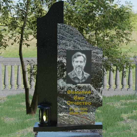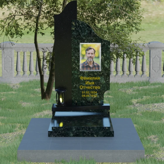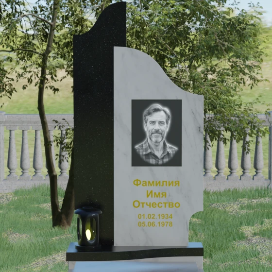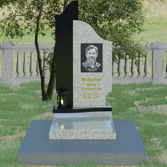 Данная мемориальная композиция представляет собой сложный архитектурный ансамбль, в основе которого лежит игра геометрических форм и контрастных фактур. Основная стела состоит из двух вертикальных элементов разной высоты и конфигурации, что создает динамичный и в то же время уравновешенный силуэт. Левая часть стелы выполнена с мягким, волнообразным изгибом, напоминающим спокойное течение времени или уходящий за горизонт путь. Правая часть — более высокая, узкая и статная, с асимметричным «рваным» навершием, которое символизирует возвышенность духа и незыблемость памяти. Такое сочетание плавности и резкости делает это надгробие из натурального камня универсальным решением, способным передать как нежность утраты, так и твердость характера ушедшего человека.
