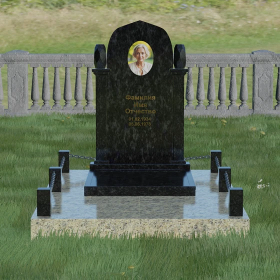 Особого внимания заслуживает безупречная зеркальная полировка. Глубокий блеск камня контрастирует с матовыми элементами и золотым тиснением знаков, создавая эффект торжественности. Вся композиция установлена на массивный гранитный цоколь, который полностью закрывает участок полированными плитами. Такое решение не только придает комплексу монументальный вид, но и практически исключает необходимость сложного ухода: на участке не будет сорняков и лишней влаги. Завершают ансамбль строгие столбики по периметру, соединенные декоративными цепями, что визуально очерчивает границы личного пространства и создает атмосферу уединения.