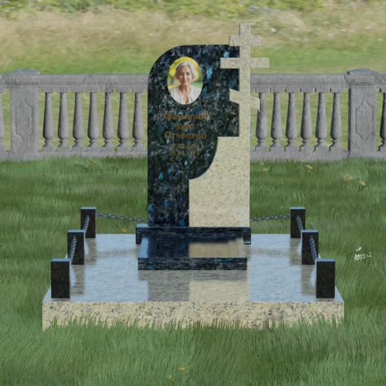 Игра контрастов — главная эстетическая особенность этого изделия. Сочетание глубокого темного камня с зеркальной полировкой и более светлого, фактурного гранита создает визуальный объем и подчеркивает торжественность момента. Такая форма идеально подходит для выражения скорби через красоту и долговечность. Плавные линии резьбы на переходе между элементами напоминают о том, что память о человеке не имеет острых углов, она течет сквозь время, оставаясь неизменной и чистой.
