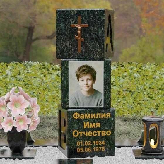 Представленное надгробие из натурального камня (Артикул: 142) — это не просто памятный знак, а монументальное архитектурное произведение, выполненное в стиле современного мемориального минимализма. В отличие от стандартных решений, данная модель представляет собой композицию из трех массивных кубических блоков, установленных друг на друга. Такая форма символизирует устойчивость, многогранность человеческой жизни и незыблемость семейного фундамента. Каждая грань камня подвергнута безупречной зеркальной полировке, которая создает глубокую игру света и отражений, подчеркивая природную чистоту материала.