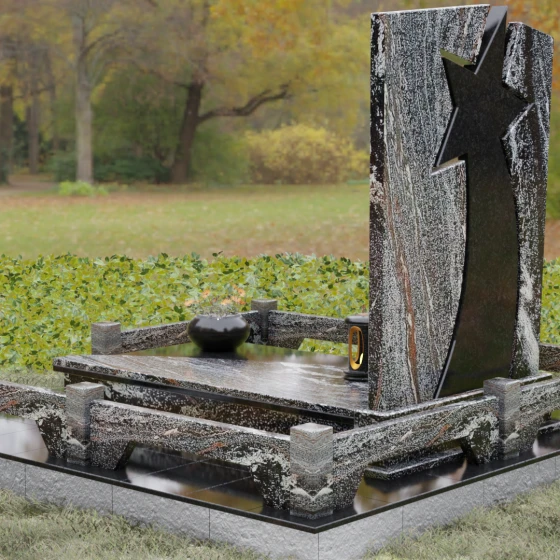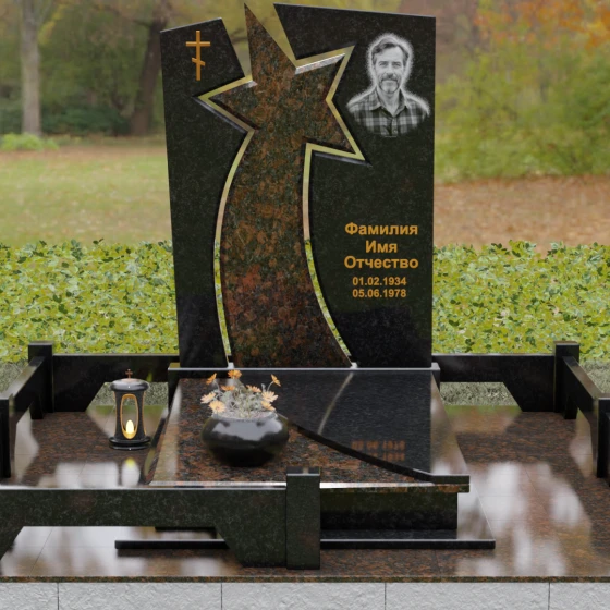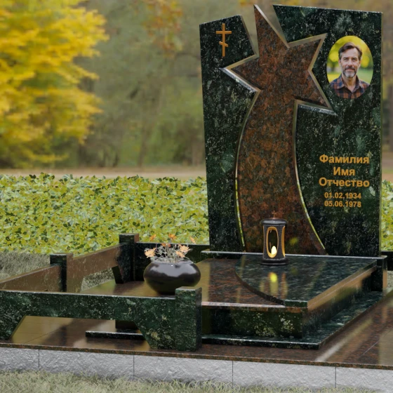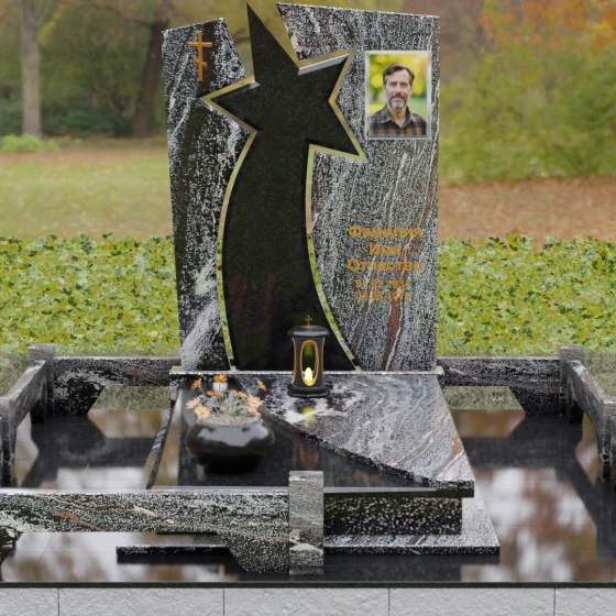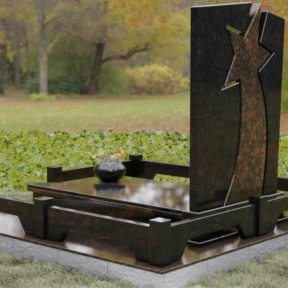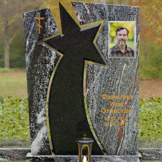 Форма этого мемориала наполнена глубокими смыслами. Центральный символ — звезда — традиционно олицетворяет путеводный свет, высокие достижения и бессмертие души. Для тех, чья жизнь была связана со служением отечеству, этот элемент подчеркивает их доблесть и профессиональный путь. В сочетании с православным крестом композиция говорит о единстве земного подвига и духовного упокоения. Плавные, дугообразные линии, обрамляющие центральную вставку, символизируют непрерывность времени и защиту, которую обретает душа в вечности. Асимметричная верхушка стелы подчеркивает индивидуальность и неповторимость жизненного пути человека.