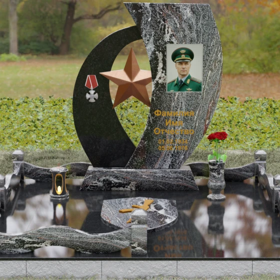 Кому подойдет: Данный мемориальный комплекс спроектирован для увековечивания памяти мужчин, чья жизнь была связана с воинским долгом, государственной службой или героическими поступками. Он станет достойным символом последнего пристанища для ветерана, кадрового офицера или человека с твердым характером. Армейская символика в сочетании с изысканным европейским стилем благоустройства (каменная ваза для живых цветов, лаконичная лампада на постаменте) подчеркивает уважение семьи к заслугам и личным качествам дорогого человека.
