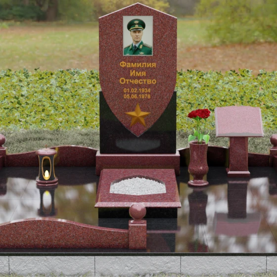 Форма щита в мемориальной архитектуре традиционно олицетворяет защиту, честь и непоколебимую волю. Это надгробие из натурального камня словно оберегает покой усопшего, напоминая о его мужестве и твердости духа. Выбор именно такой формы подчеркивает, что человек при жизни был опорой для своей семьи и преданно служил своему делу. Звезда и строгие формы акцентируют внимание на дисциплине и преданности идеалам.