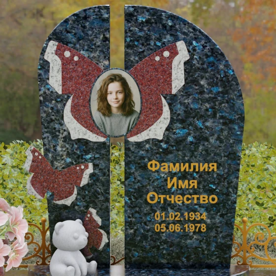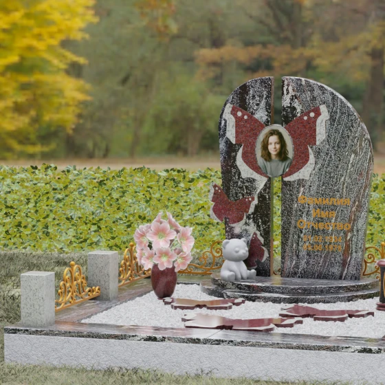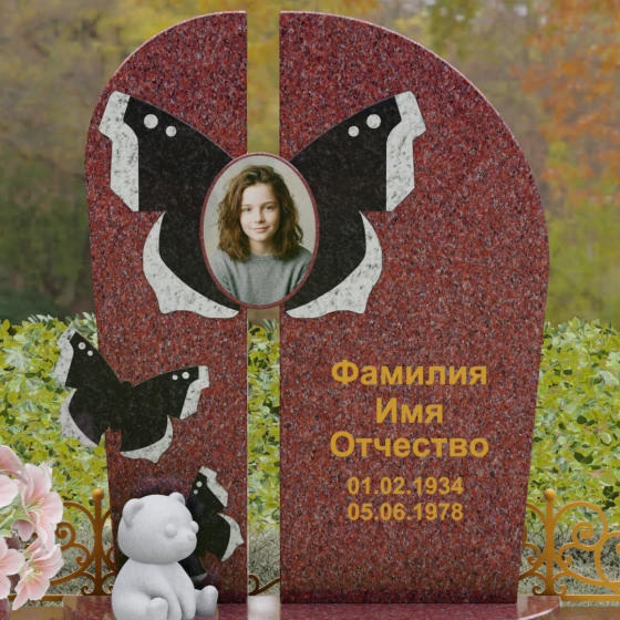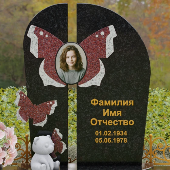 Центральным элементом ансамбля выступает величественная вертикальная стела, разделенная узким вертикальным просветом на две симметричные части. Этот архитектурный прием создает эффект воздушности и позволяет свету проникать сквозь плотную массу камня, символизируя открытость небесных врат и свободу духа. Верхушка стелы оформлена плавным полукруглым изгибом, лишенным острых углов, что дарит ощущение абсолютного умиротворения и вечного покоя. Главным художественным акцентом является мастерски выполненная инкрустация в виде расправленных крыльев бабочки, которые бережно обрамляют центральный овальный портрет. Контрастная игра фактур — зеркально-черного полированного гранита и насыщенных красных вставок с белым природным рисунком — создает поразительный визуальный объем. Изящная золоченая гравировка шрифта придает оформлению особую торжественность, отчетливо выделяясь на темном фоне камня и сохраняя читаемость на долгие десятилетия.