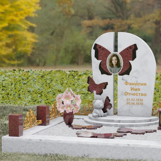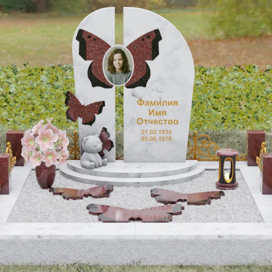 Форма и декоративное наполнение этого мемориального ансамбля пронизаны глубоким философским смыслом. Бабочка — древнейший символ человеческой души, проходящей через земную трансформацию и обретающей легкость в ином мире. Ее присутствие на стеле и в виде отдельных резных элементов, расположенных на поверхности цветника, говорит о хрупкости жизни и надежде на вечное возрождение. Плавные линии изгибов олицетворяют гармоничное течение времени и бесконечность памяти. Маленькая фигура белоснежного медвежонка у подножия стелы вносит ноту трогательной нежности, напоминая о чистоте чувств, искренности и той глубокой привязанности, которая не исчезает с уходом близкого.