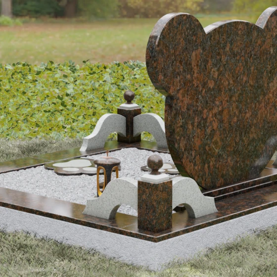Завершают облик ансамбля функциональные и декоративные элементы: изящная гранитная ваза с плавными изгибами и закрытая каменная лампада, внутри которой мягко мерцает свет. Каждый элемент этой мемориальной композиции, от филигранно выточенных «ушек» до зеркально отполированной надгробной плиты, свидетельствует о глубоком уважении к памяти ушедшего. Это исполненное любви и профессионализма воплощение вечности в камне, которое станет достойным символом памяти, согревающим сердце своей теплотой и совершенством форм.
