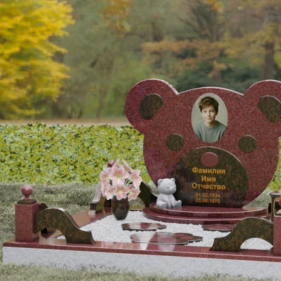 Эта мемориальная композиция представляет собой уникальный художественный проект, созданный для того, чтобы выразить бесконечную нежность и светлую печаль. Главная стела выполнена в форме головы медвежонка — символа чистоты, детства и вечного сна. Плавные, округлые линии силуэта лишены острых углов, что придает изделию визуальную мягкость и умиротворение. Мастера-камнерезы виртуозно передали геометрию образа: симметричные ушки со светлыми вставками и выразительные круглые глаза, созданные методом инкрустации камня другого оттенка. Игра контрастов между глубоким темным основанием и светлым матовым срезом декоративных элементов создает эффект живого объема, заставляя свет играть на полированных гранях и подчеркивая безупречную пластику камня.