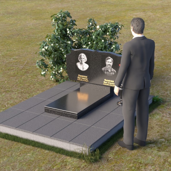 Композиция монумента строится на контрасте плавных линий и строгих геометрических форм. Верхняя часть, несущая на себе портреты усопших, имеет форму, напоминающую раскрытую книгу или свиток, где каждая страница хранит историю жизни. Края этого "свитка" искусно обработаны: верхняя грань словно оплавлена временем, приобретая мягкие, неровные очертания, а боковые стороны имеют более четкий, но все же сглаженный профиль. Фаска, идущая по периметру, придает верхней части визуальную легкость, отделяя ее от основания. Нижняя часть представляет собой прямоугольную плиту с зеркальной полировкой, отражающей небо и окружающий мир, создавая эффект бесконечности и связи с ушедшим. Она словно портал, соединяющий мир живых и мир мертвых, напоминая о непрерывности бытия. Боковины плиты имеют четкую геометрию, подчеркивая основательность и незыблемость памяти.