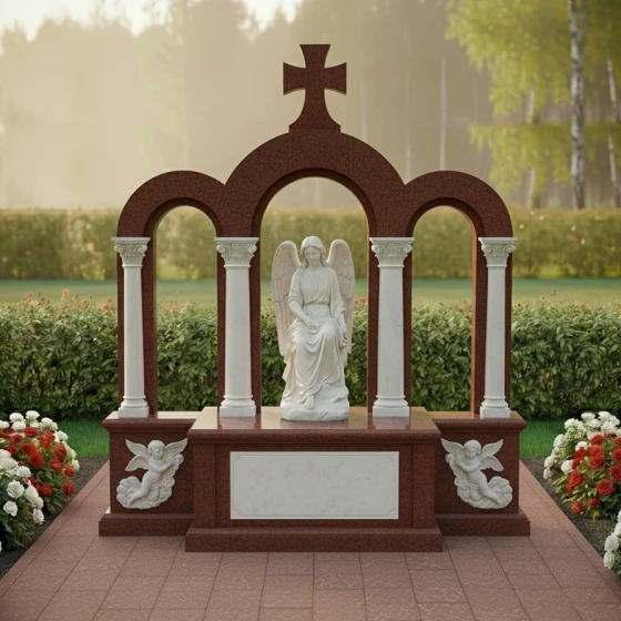 Скульптура ангела заключена в монументальную аркаду, выполненную из темного полированного гранита. Эта аркада состоит из трех пролетов, поддерживаемых четырьмя колоннами. Колонны имеют классическую форму с каннелюрами и капителями, что придает всей конструкции античный вид и ощущение торжественности. Черный полированный гранит, из которого выполнены арки и колонны, создает зеркальную поверхность, отражающую свет и окружающее пространство, что символизирует бесконечность и вечное движение жизни, даже в память об ушедших. Венчает центральную арку строгий православный крест, выполненный из того же темного гранита, подчеркивающий духовную значимость и святость места упокоения. Его лаконичная форма, без распятия, говорит о чистой вере и покое души.