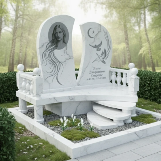 Мемориальная композиция ПН 063 представляет собой уникальное художественное произведение, где каждая линия и форма наполнены глубоким символизмом. Центральный элемент – две асимметричные стелы, словно раскрытые створки книги или два крыла, стремящиеся ввысь. Их плавные, волнообразные грани отполированы до зеркального блеска, создавая игру света и тени, подчеркивающую глубину черного гранита. Левая стела, более массивная и высокая, украшена гравировкой женского лика, выполненного с невероятной детализацией. Длинные, струящиеся волосы, обрамляющие лицо, создают ощущение легкости и воздушности, контрастируя с монументальностью камня. Правая стела, чуть ниже и изящнее, несет на себе изображения двух голубей, парящих на фоне полумесяца со звездой – символы чистоты, мира и духовного вознесения. Эти элементы выполнены с тончайшей проработкой деталей, где каждая перышко и изгиб крыла кажутся живыми, а матовая фактура гравировки эффектно выделяется на фоне глянцевой поверхности.