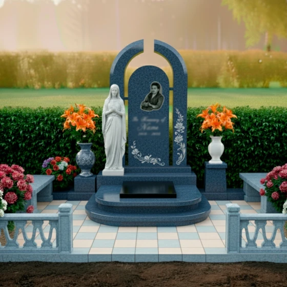 Мемориальная композиция «Врата Вечности» изготовлена из высококачественного гранита, материала, который по праву считается эталоном прочности и долговечности. Гранит обладает исключительной плотностью, что делает его устойчивым к любым атмосферным воздействиям – будь то суровые морозы, палящее солнце или проливные дожди. Его морозостойкость гарантирует сохранение первозданного вида на протяжении многих десятилетий, а низкое водопоглощение предотвращает образование трещин и разрушение структуры. Зеркальная полировка поверхности гранита не только придает ему благородный и роскошный вид, но и обеспечивает легкость в уходе, отталкивая грязь и пыль. Игра света и тени на идеально гладких гранях создает эффект объема и глубины, подчеркивая каждую деталь резьбы и гравировки. Эта модель доступна в восьми роскошных цветовых решениях: семи видах гранита (амфиболит, Балтик грин, Блю Перл, Габбро-диабаз, Дымовский, Лезниковский, Мансуровский) и одном виде мрамора (Тассо). Такое разнообразие позволяет подобрать идеальный камень, который будет максимально соответствовать характеру и индивидуальности ушедшего, создавая по-настоящему персонализированный и уникальный мемориал.