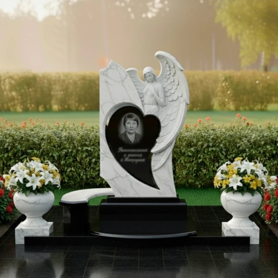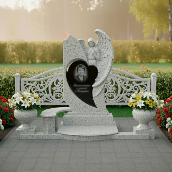 Особое внимание привлекает мастерски выполненная резьба. В верхней части стелы, словно вырастая из самого камня, мы видим объемную фигуру ангела. Его крылья, с тщательно проработанными перьями, кажутся легкими и воздушными, несмотря на твердость камня. Лик ангела обращен вверх, выражая покой и надежду, а его руки сложены в молитвенном жесте. Эта деталь несет в себе мощный символизм, предлагая утешение и напоминание о духовной связи. В центре композиции, в обрамлении сердца, расположена ниша для портрета, которая словно погружается в камень, создавая эффект глубины и интимности. Надпись выполнена изящным шрифтом, подчеркивая торжественность момента. Все грани стелы тщательно обработаны, создавая ощущение завершенности и монументальности.