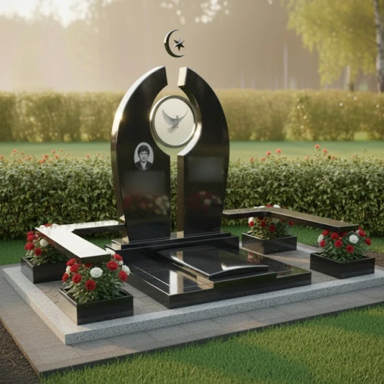 В основе композиции лежит впечатляющая стела, выполненная в уникальной архитектурной форме, напоминающей раскрытые врата или арку, символизирующую переход и вечность. Ее грани обработаны с особой тщательностью, создавая игру света и тени: идеально отполированные до зеркального блеска фронтальные и боковые поверхности контрастируют с тонкими матовыми срезами, подчеркивающими объем и глубину камня. Центральный элемент стелы — изящная полукруглая арка, увенчанная полумесяцем и звездой, выполненными в объемной резьбе, что придает изделию выразительность и духовное значение.
