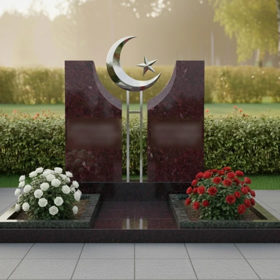 Данное ритуальное изделие представляет собой величественную парную композицию, воплощающую идею неразрывной духовной связи и вечного покоя. В центре художественного замысла находятся две вертикальные стелы, симметрично расположенные друг относительно друга. Их строгая геометрия смягчена изящными вогнутыми фасками во внутренней части: мастера-камнерезы ювелирно выбрали камень, создав идеальную полукруглую нишу. В этом пространстве, словно паря над землей, установлен главный символ веры — объемный полумесяц со звездой. Сочетание природного камня и металлического элемента подчеркивает статус захоронения и придает всей конструкции торжественный, одухотворенный вид.