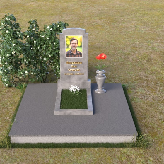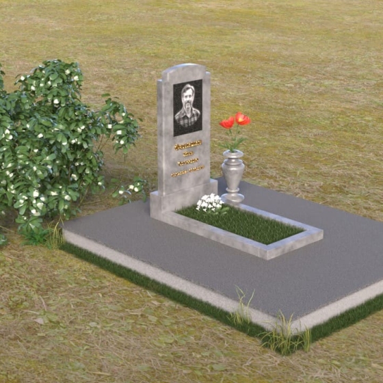 Основной акцент в этой модели сделан на контрасте фактур. Зеркальная полировка черного гранита Габбро-диабаз, из которого выполнена стела, создает эффект бесконечности, отражая небо и окружающий мир. На этом фоне особенно выразительно смотрится гравировка портрета и надписи, выполненные с ювелирной точностью. Нижняя часть стелы, переходящая в горизонтальную плиту, также выполнена из черного гранита, но уже с матовой обработкой, что придает композиции дополнительную глубину и текстуру. Рядом располагается ваза из того же гранита, выполненная в классическом стиле, предназначенная для живых цветов, которые станут символом памяти и любви.