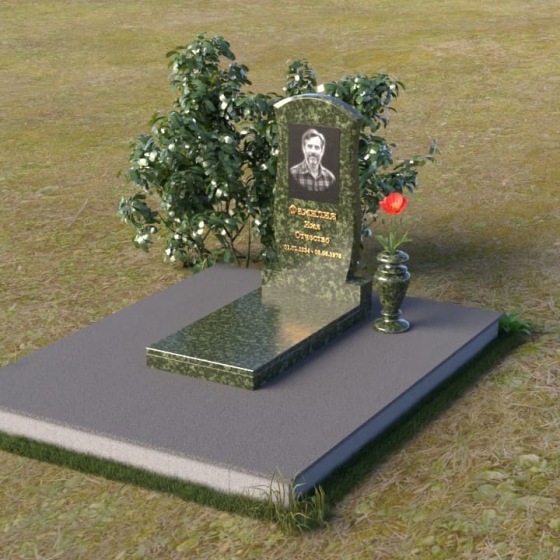 Данная модель предоставляет широкие возможности для индивидуального оформления. Портрет усопшего, выполненный методом гравировки, идеально вписывается в общую композицию, занимая центральное место на стеле. Золотистые буквы надписи, контрастируя с темным фоном полированного гранита, выглядят торжественно и выразительно. Мы рекомендуем выбирать фотографии высокого разрешения для достижения максимальной детализации и реалистичности портрета. Также возможно добавление дополнительных декоративных элементов, таких как эпитафии, религиозные символы или памятные даты. Небольшая подставка, выполненная в том же стиле, что и стела, гармонично дополняет композицию и может служить местом для возложения цветов. Элегантная ваза из черного гранита, расположенная рядом с надгробием, добавляет завершенность образу и позволяет сохранить свежесть цветов на длительное время.