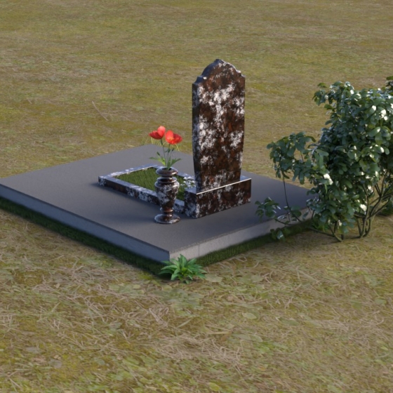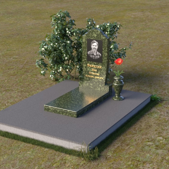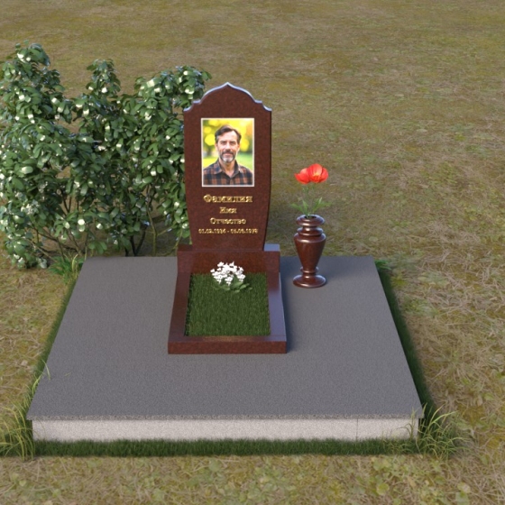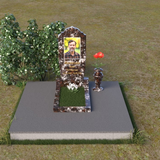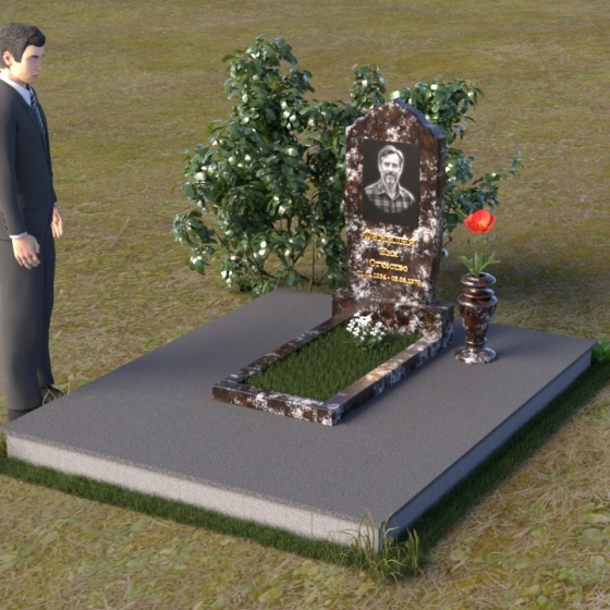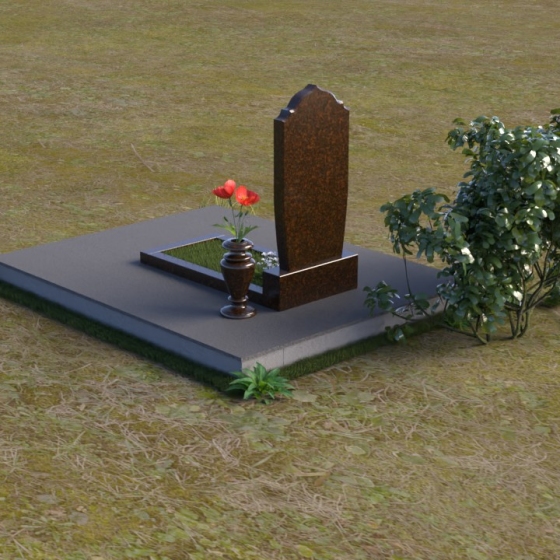 Надгробие из натурального камня ПВ 061 представляет собой элегантную композицию, сочетающую в себе строгость линий и плавные изгибы. Основная стела имеет форму, напоминающую стилизованную арку, с мягкими, скругленными плечами. Верхняя часть стелы украшена деликатными выемками, создающими эффект благородной старины. Боковые грани стелы тщательно отполированы, что придает памятнику законченный и респектабельный вид. Нижняя часть стелы переходит в прямоугольное основание, на которое устанавливается горизонтальная плита. Эта плита, выполненная в зеркальной полировке, отражает небо и окружающий ландшафт, создавая ощущение легкости и воздушности. Фаски на плитах аккуратно сняты, подчеркивая геометрию форм. Сбоку от основной стелы располагается небольшая ваза, выполненная в том же стиле и из того же материала, что и памятник. Ее изящная форма добавляет композиции завершенность и позволяет разместить живые цветы, символизирующие вечную память.