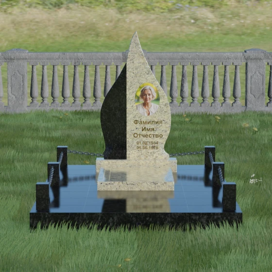 Выбор мемориального изделия — это всегда глубоко личный процесс, стремление выразить в камне ту нежность и уважение, которые мы храним в сердце. Модель 018 воплощает в себе гармонию и завершенность. Величественная стела выполнена в форме изящного, стремящегося ввысь пламени или капли, что символизирует вечный свет души и неугасаемую память. Асимметричная геометрия с мягкими, плавными изгибами лишена острых углов, что подчеркивает идею спокойствия и вечного упокоения. Особое внимание привлекает сочетание двух контрастных видов камня: светлая левая часть стелы с её благородной зернистой фактурой мягко огибает темную зеркальную сердцевину. Этот контраст создает визуальный объем и глубину, подчеркивая уникальность композиции и делая её заметной на фоне традиционных строгих форм.