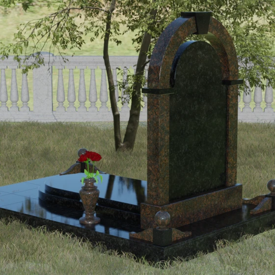 Представленная мемориальная композиция — это триумф архитектурной мысли, воплощенный в благородном камне. В основе дизайна лежит классическая форма арки, которая во многих культурах символизирует небесный свод и торжественный переход в вечность. Центральная стела, имеющая мягкое скругление сверху, обрамлена массивным внешним контуром, создающим эффект глубины и защищенности. Такое многоуровневое решение позволяет играть на визуальных объемах: строгие вертикальные линии боковых колонн уравновешиваются плавным изгибом верхней части, подчеркивая гармонию и покой. Зеркальная полировка лицевых граней доведена до совершенства, в ней отражается мир, напоминая о хрупкой связи между прошлым и настоящим.