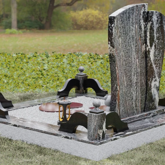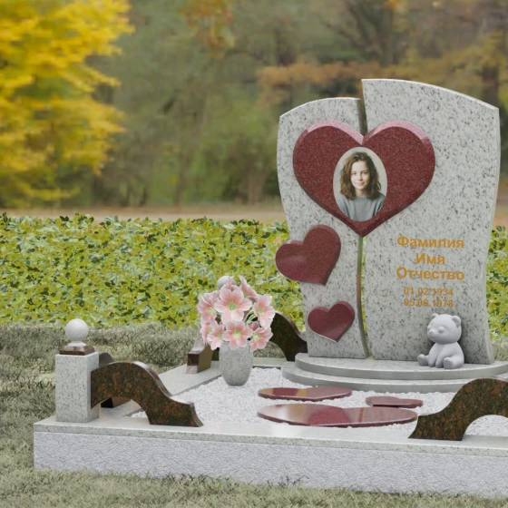 Оформление: Уникальная геометрия этого надгробия сама подсказывает идеальное расположение гравировки. Крупное центральное сердце словно создано для размещения портрета — здесь он будет главным смысловым акцентом, защищенным символом любви. Правую, более широкую часть плиты, рекомендуется использовать для нанесения Фамилии, Имени, Отчества и дат жизни. Здесь же останется достаточно места для проникновенной эпитафии или дополнительного декоративного элемента, например, небольшой виньетки или креста.