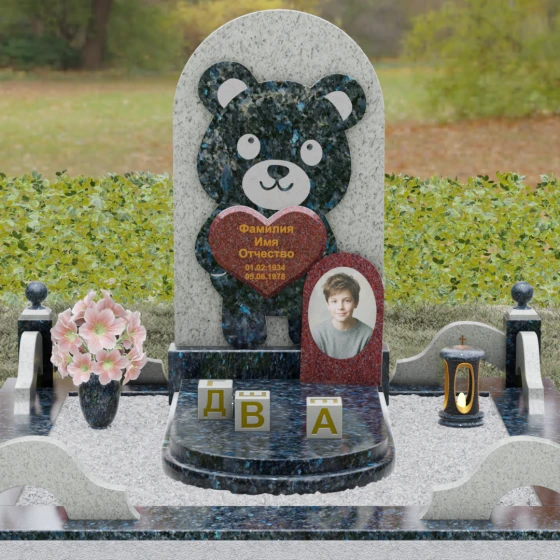 Данная мемориальная композиция представляет собой уникальное сочетание трогательной нежности и величественной непоколебимости камня. В центре художественного замысла лежит глубокий символизм: фигура медвежонка, бережно держащего в лапах сердце, олицетворяет чистоту, бесконечную родительскую любовь и защиту, которую близкие стремятся подарить даже после ухода дорогого человека. Это надгробие из натурального камня выполнено в технике художественного комбинирования различных пород, что создает потрясающий визуальный объем. Массивная светлая стела с полукруглым завершением служит идеальным фоном для темного силуэта, вырезанного с ювелирной точностью. Игра контрастов между зеркальной полировкой черного камня и благородной текстурой светлого гранита подчеркивает каждую деталь: от доброго взгляда лесного покровителя до мягких контуров его фигуры.