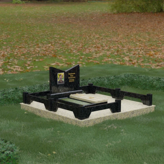 Центральным элементом композиции является вертикальная стела, форма которой напоминает раскрытую книгу или расправленные крылья. Геометрия здесь безупречна: верхний срез выполнен в виде четкого V-образного угла, направленного внутрь, что создает динамику и устремленность композиции к центру — к портрету и имени. Боковые грани стелы тщательно отполированы, а фаски сняты под таким углом, чтобы максимально эффективно играть на контрасте света и тени. Зеркальная черная поверхность основного камня идеально подчеркивает золотую гравировку и создает глубокий объем, отражая окружающее пространство и делая памятник визуально легким, несмотря на его внушительный вес.