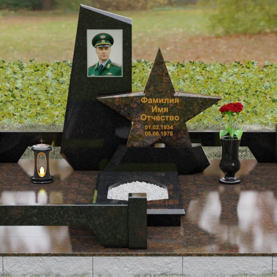 Кому подойдет: Это ритуальное изделие станет достойным выбором для увековечивания памяти военного, ветерана боевых действий или человека, чья профессиональная деятельность была связана с защитой Отечества. Символика звезды в сочетании со строгими линиями олицетворяет мужество, честь и верность идеалам. Благодаря своей величественной форме и архитектурной сложности, такой ансамбль подойдет для установки на почетном месте захоронения главы семьи, подчеркивая его высокий статус и значимость для потомков.