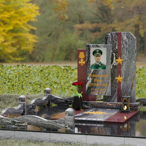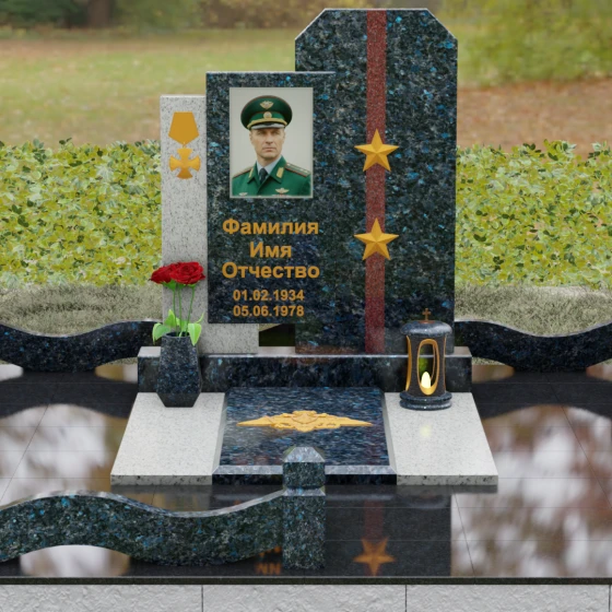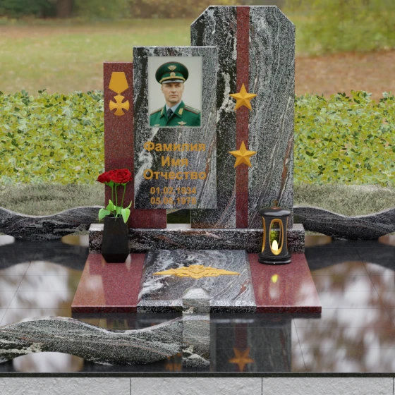 Выбор мемориального комплекса — это всегда поиск баланса между строгостью формы и глубиной чувств. Модель Артикул 201 представляет собой сложную архитектурную композицию, которая идеально подходит для увековечивания памяти сильного, волевого человека, посвятившего жизнь служению. Надгробие из натурального камня состоит из трех вертикальных элементов, создающих динамичный, ступенчатый силуэт. Центральная стела, предназначенная для размещения портрета и основной информации, обрамлена боковыми пилонами из контрастного красного гранита. Такая геометрия символизирует устойчивость, надежную опору и непоколебимость духа. Сочетание строгих прямых линий и аккуратных фасок на вершинах придает памятнику торжественный, парадный вид, подчеркивая заслуги и особый статус усопшего.