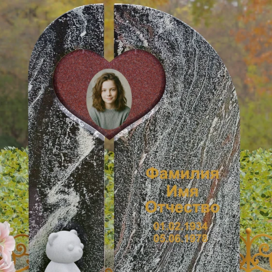 Данный гранитный монумент представляет собой сложную архитектурную композицию, где классические каноны мемориального искусства встречаются с современным европейским стилем. Выбор этой модели обусловлен её глубоким символизмом: центральный элемент выполнен в виде асимметричного полотна с изящным вырезом в форме сердца. Этот художественный прием превращает холодный камень в осязаемое воплощение любви и непреходящей скорби. Плавный изгиб верхней грани и вертикальное разделение основной плиты создают динамичный, но при этом умиротворенный силуэт, который гармонично доминирует над пространством захоронения.
