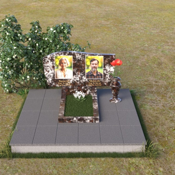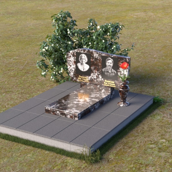 Этот памятник являет собой образец мастерства в обработке камня. Особое внимание привлекает игра контрастов: зеркально отполированный гранит, отражающий небо и окружающий мир, и деликатно выгравированные портреты усопших. Лаконичная ваза, выполненная в том же стиле, что и стела, гармонично дополняет композицию и служит местом для живых цветов, символизирующих вечную память и любовь.