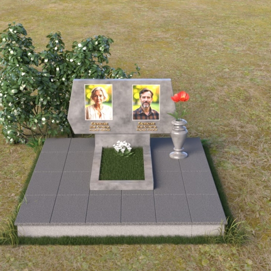 Представляем вам ритуальное изделие – памятник на могилу (Артикул: ПГ018), архитектурное решение, в котором строгость линий сочетается с глубоким символизмом. Это не просто надгробие, а осязаемое воплощение уважения и вечной памяти об ушедшем человеке. Стела, выполненная в форме сдержанного прямоугольника, слегка расширяющегося кверху, символизирует восхождение души к небесам. Грани камня тщательно обработаны, создавая игру света и тени, подчеркивающую монументальность и значимость этого места памяти. Слева и справа, верхние углы стелы имеют элегантные скосы, смягчающие строгость формы и придающие ей утонченность. На зеркальной поверхности камня выгравированы портреты усопших, их имена и даты жизни, выполненные с безупречной точностью и вниманием к деталям. Под портретами располагаются лаконичные надписи, выполненные строгим шрифтом, добавляющие памятнику сдержанности и достоинства. Дополнительная горизонтальная плита, расположенная перед стелой, создает ощущение завершенности и служит местом для возложения цветов или свечей. Этот элемент композиции выполнен в той же стилистике, что и основная стела, поддерживая общую гармонию и пропорциональность мемориального комплекса.