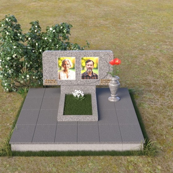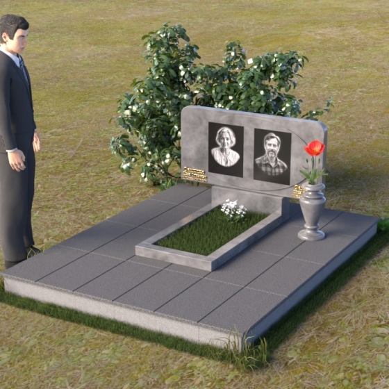 Форма стелы этого ритуального изделия идеально подходит для размещения двух портретов. Композиция с двумя изображениями, выполненными в технике гравировки, выглядит гармонично и сбалансированно. Под портретами можно расположить надпись с именем, датами жизни и короткой эпитафией. Золотое тиснение букв на черном граните создает эффект контраста и придает тексту дополнительную выразительность. Небольшая тумба, расположенная под стелой, служит подставкой для плиты с именами и годами жизни. Рядом с памятником можно установить вазу для цветов, выполненную в том же стиле и из того же материала, что и сам памятник. Это создаст единый ансамбль и подчеркнет целостность композиции. Дополнительно можно установить лампаду или небольшой фонарь, которые будут освещать памятник в темное время суток, создавая атмосферу умиротворения и светлой памяти.